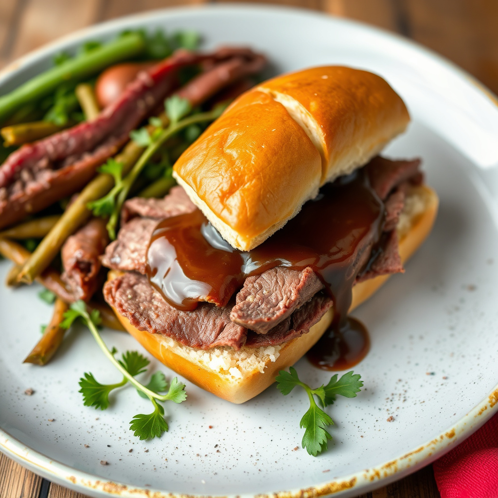 3For bygging av smørbrødet: Plasser bunnene av rundstykkene på en arbeidsflate. Legg de skivede hjemmelagde roastbiffene på bunnen. Topp med én skive gruyère hver, noen sylteagurker og vannkress. Dekk med toppene av rundstykkene. Skjær hvert smørbrød i to, dypp i au jus og innse at noen ganger er rester bare bedre.