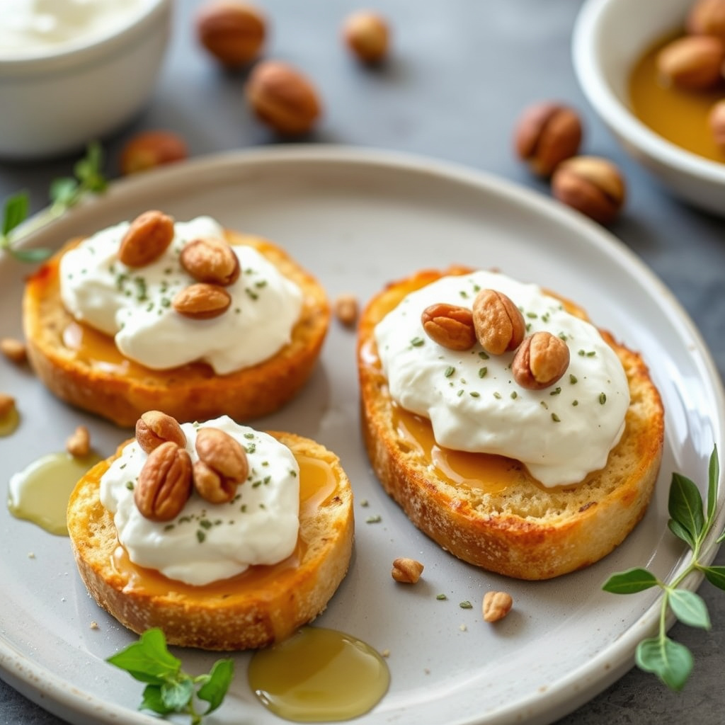 oppskrift på crostini med søt ricotta, honning og ristede hasselnøtter. perfekt som forrett eller snacks, enkel å lage og smakfull.