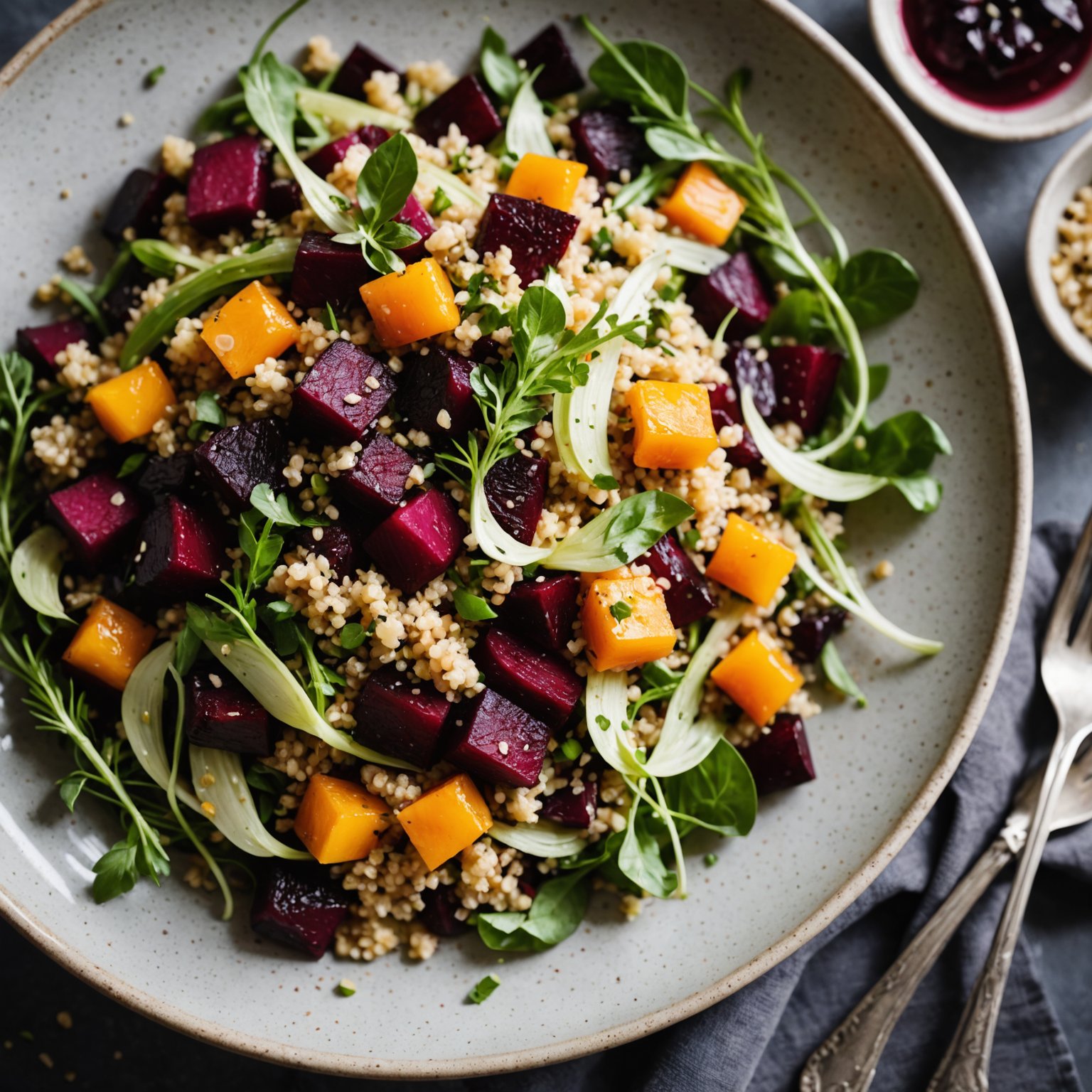 oppskrift på en frisk quinoa salat med søt rødbete og aromatisk fennikeldressing, perfekt for sommermåltider eller som lett forrett