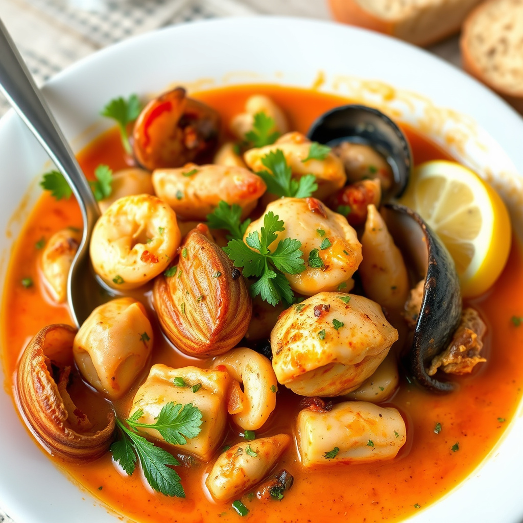 oppskrift på crab and seafood cioppino, en smakfull sjømatgryte fra italien. perfekt for sjømatelskere som vil lage en varm og fyldig rett hjemme.