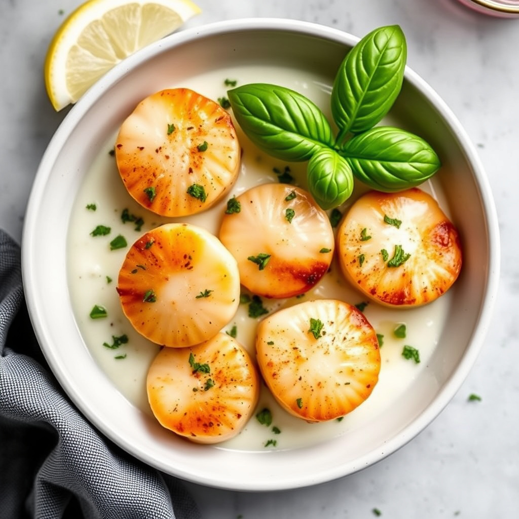 Lær hvordan du lager deilige scallops med krem og basilikum. Perfekt forrettrett til en spesiell anledning eller en rask middag.