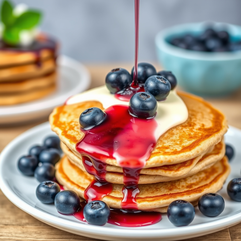 Lær hvordan du lager deilige blåbær fullkornspannekaker med hjemmelaget blåbærsaus. Perfekt for en sunn frokost eller brunch med friske bær og søt sirup.