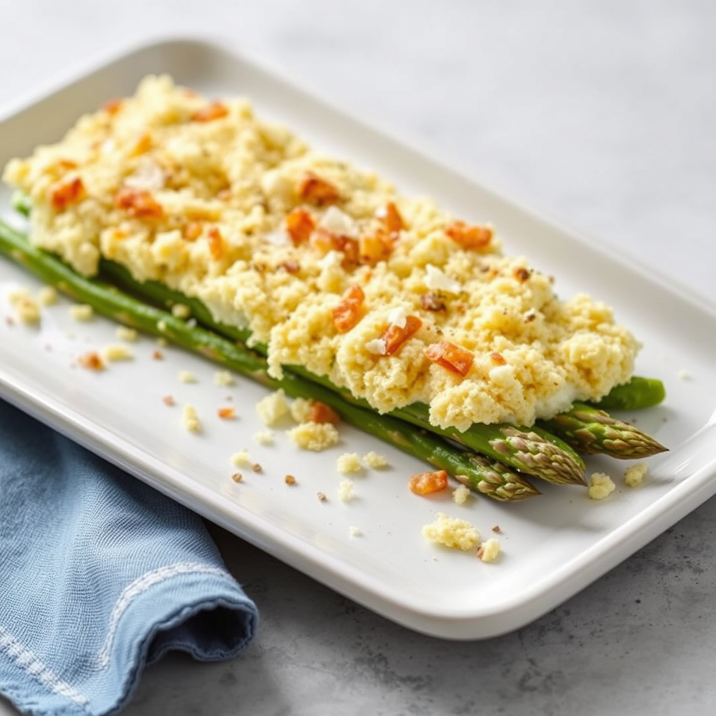 - 5Anrett aspargesen på et serveringsfat og topp med Parmesan-egg-krumme topping.
