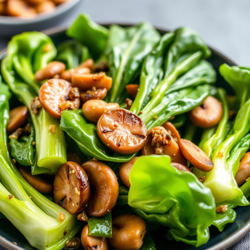 oppskrift på rask og sunn stir-fried baby bok choy med smakfulle shiitake sopp, perfekt som en lett forrett eller sidesrett.