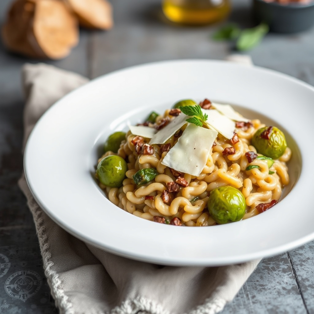 24Fordel risottoen på serveringsfat, og topp med rosenkål, sprø guanciale og hakket gressløk før servering.
