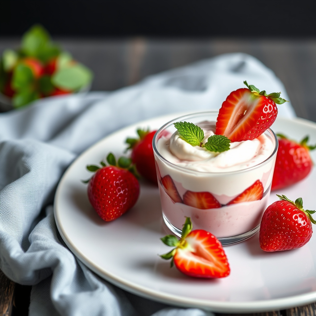- 3Fordel jordbærblandingen i individuelle glass. Knus noen ladyfingers og legg dem oppå. Pynt hver med en kvist mynte og en hel jordbær!