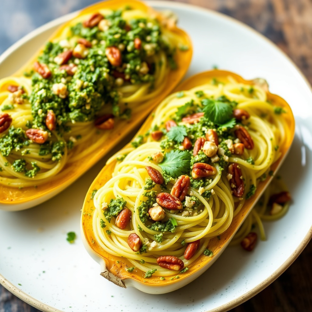 oppskrift på spaghetti squash med frisk persille og kremet pekannøttpesto. en sunn og smakfull rett som passer til enhver anledning.