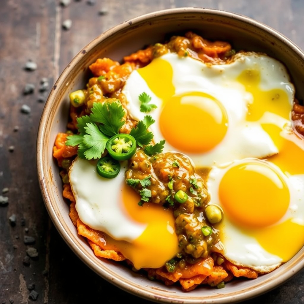 oppskrift på huevos rancheros med frisk tomatillo salsa. perfekt for en smakfull frokost eller brunch. enkel å lage og full av smak.