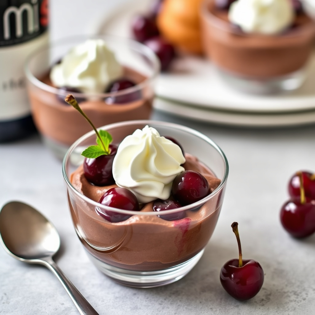 oppskrift på en lekker sjokolademousse med vinmarinerte kirsebær og luftig pisket krem. perfekt dessert for spesielle anledninger.