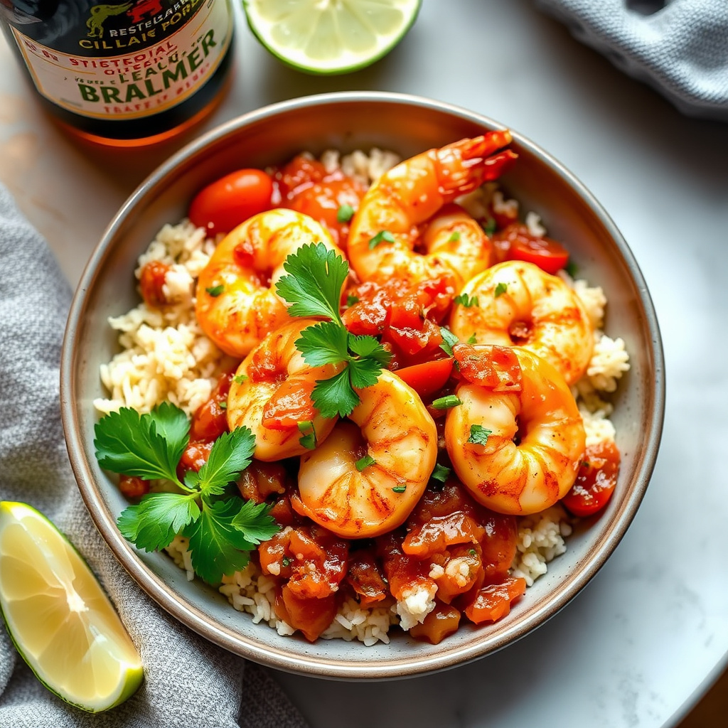 Ølbraiserte reker med Louisiana-salsa og ris