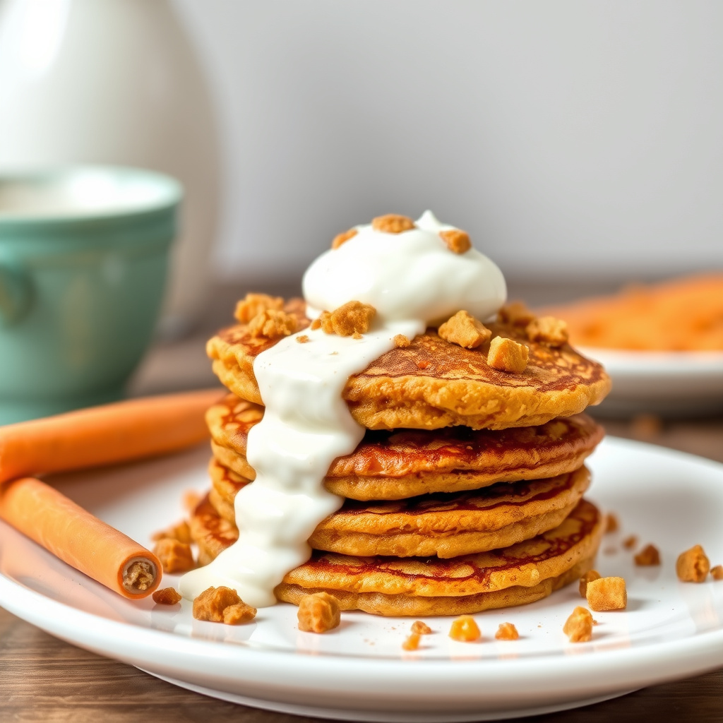 oppskrift på deilige gulerotkakpannekaker servert med søtet yoghurt. perfekt for frokost eller brunch. enkel å lage og smakfull.