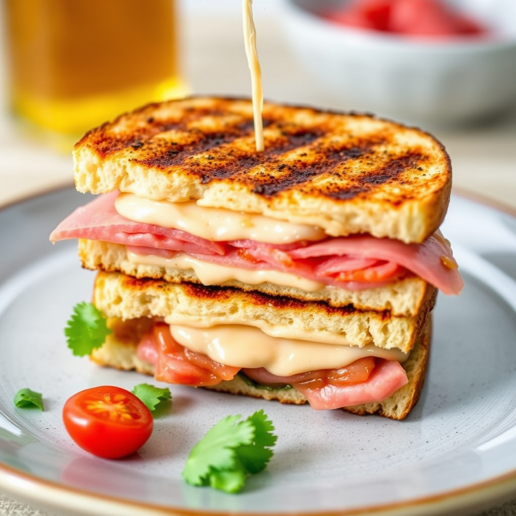 6Legg smørbrødet på grillen, plasser et stort bakepapir oppå og legg en stor støpejernspanne eller to store hermetikkbokser oppå for å presse det ned. Grill i 5 minutter, fjern bakepapiret og vekten, snu smørbrødet, legg vekten på igjen og grill til den sveitsiske osten har smeltet, ca. 5 minutter til.