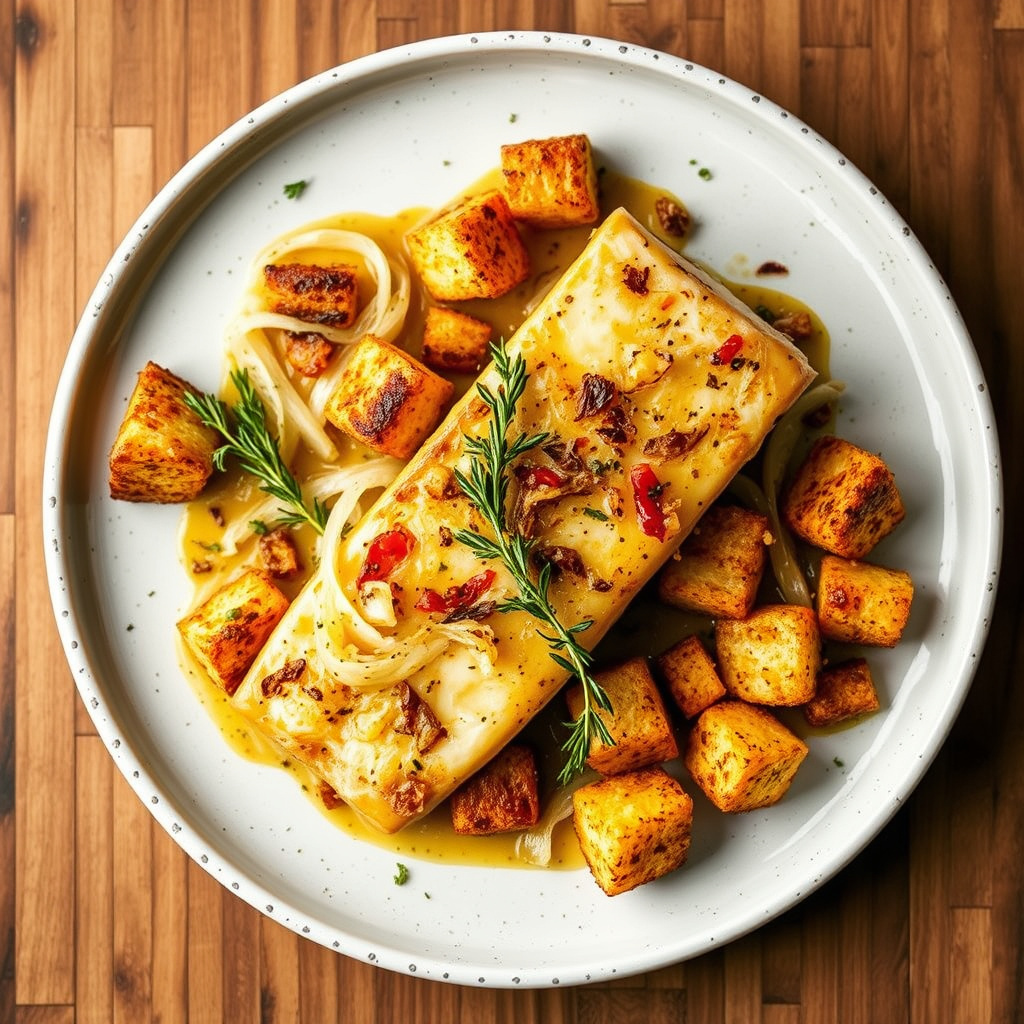 oppskrift på ovnsbakt halibut med smakfull fennikel og sprø krutonger, perfekt for en sunn og velsmakende hovedrett