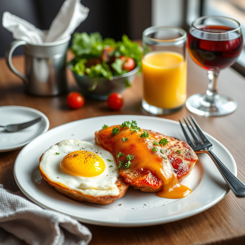 oppskrift på en klassisk new york breakfast med sprø bacon, fluffy pannekaker og fersk frukt. perfekt for en energisk start på dagen.