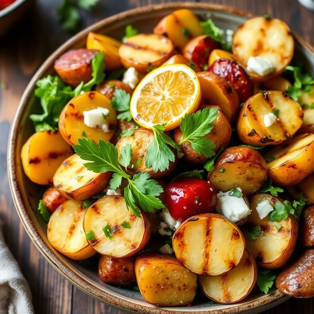 Oppdag hvordan du lager en smakfull grillet potetsalat med en krydret appelsin chipotle vinaigrette. Perfekt for sommergrilling og utendørs måltider.