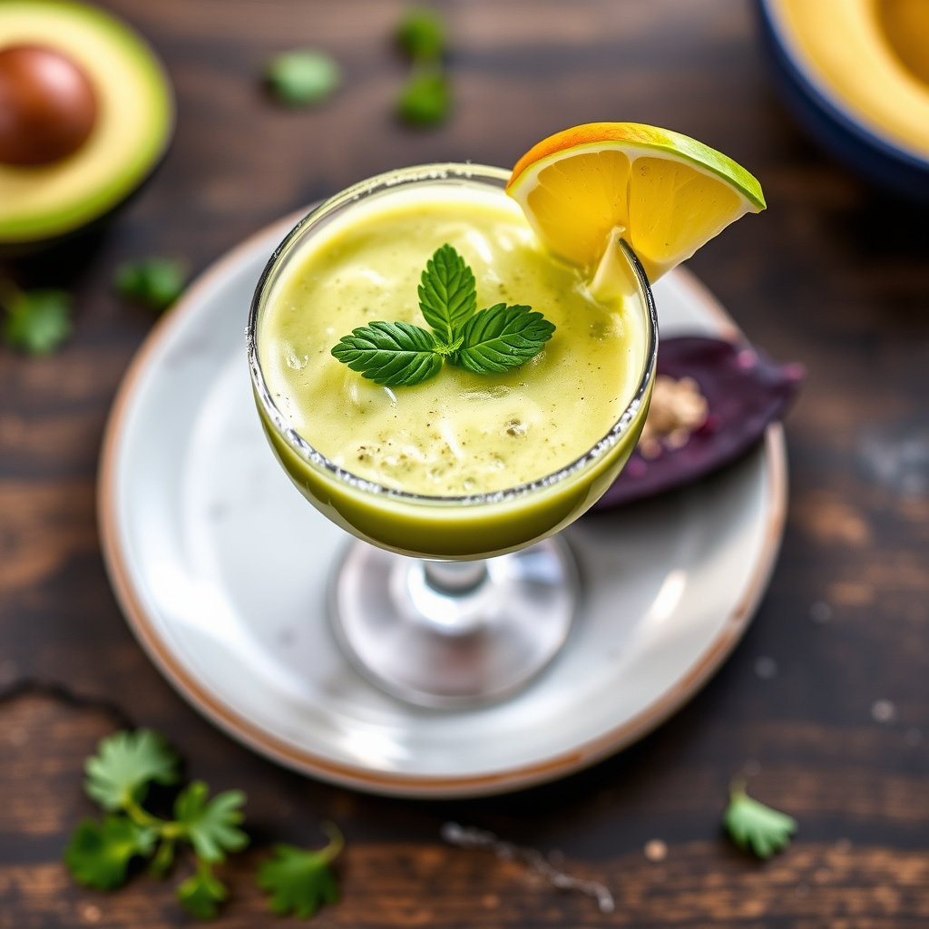 1Bland avocado, mezcal eller tequila, triple sec, agavenektar og limesaft med is til det er jevnt. Gni kanten på en margaritaglass med krydret salt, og pynt med en skive avocado.