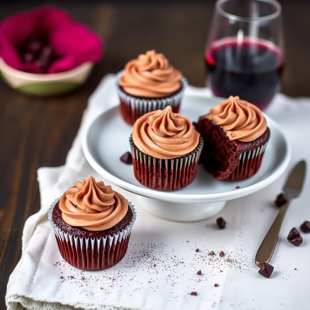 oppskrift på deilige rødvin-chokolade cupcakes, perfekte som dessert eller til fest. enkel å lage, med rik smak av rødvin og sjokolade.