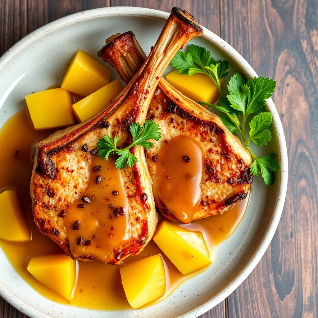 oppskrift på saftige svinekoteletter servert med en søt og aromatisk kokosrom og karamellisert ananas saus, perfekt for sommerens middager