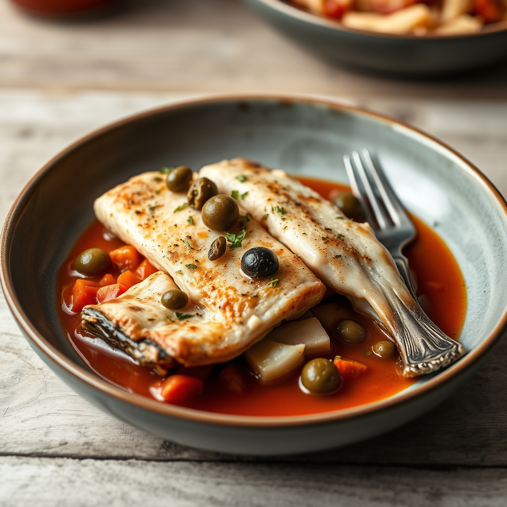 oppskrift på sturgeon med kapers, oliven og tomatsaus. en smakfull og sunn rett som passer til hver anledning.