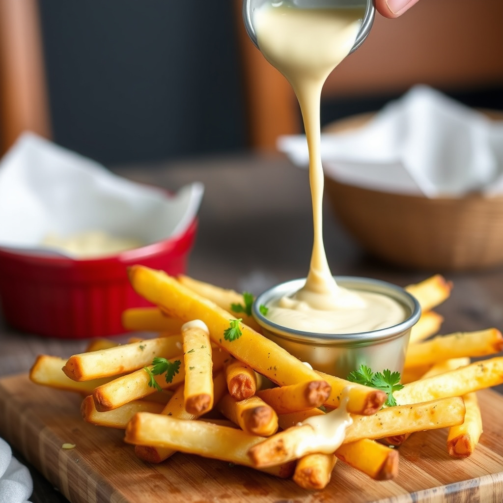 Lær hvordan du lager sprø pommes frites med kremet ovnsbakt hvitløkssmørsaus. En enkel og smakfull rett perfekt som forrett eller snacks.