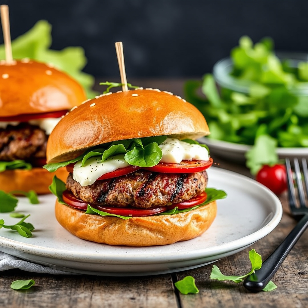 oppskrift på saftige burgere fylt med fetaost og soltørkede tomater innpakket i prosciutto. enkel og smakfull rett for sommerens grillkvelder.