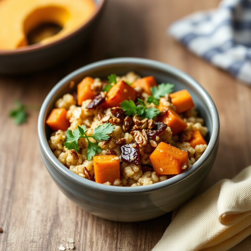 5Varm opp de resterende 2 spiseskjeene olje i en lav gryte på middels varme. Tilsett sjalottløk og kok, rør ofte med en tresleiv, til den er gjennomsiktig og myk, ca. 6 til 8 minutter. Tilsett hvitløk og kok til den er myk, ca. 3 minutter. Rør inn havregryn, 1/2 teskje salt og 1/4 teskje pepper, og rør til de er dekket av oljen. Tilsett vinen og la det småkoke, rør konstant, til væsken er absorbert, ca. 1 minutt. Tilsett 3 kopper av den varme buljongen i havregrynene, og la det småkoke, rør kontinuerlig, til mesteparten av væsken er absorbert, ca. 8 til 10 minutter. Tilsett ytterligere 2 kopper buljong og la det småkoke, rør hele tiden, til havregrynene er møre men fortsatt har litt tyggemotstand, ca. 10 til 12 minutter. (Det vil være en god del væske i gryten på dette tidspunktet, med en konsistens som en tynn saus. Den vil tykne når osten er tilsatt.) Ta av varmen og rør inn halvparten av osten og halvparten av persillen. Juster konsistensen på risottoen ved å tilsette mer buljong etter behov. Fordel den varme risottoen i fire varme serveringsskåler, og topp hver med litt smørnut squash. Strø over resten av osten og persillen før servering.