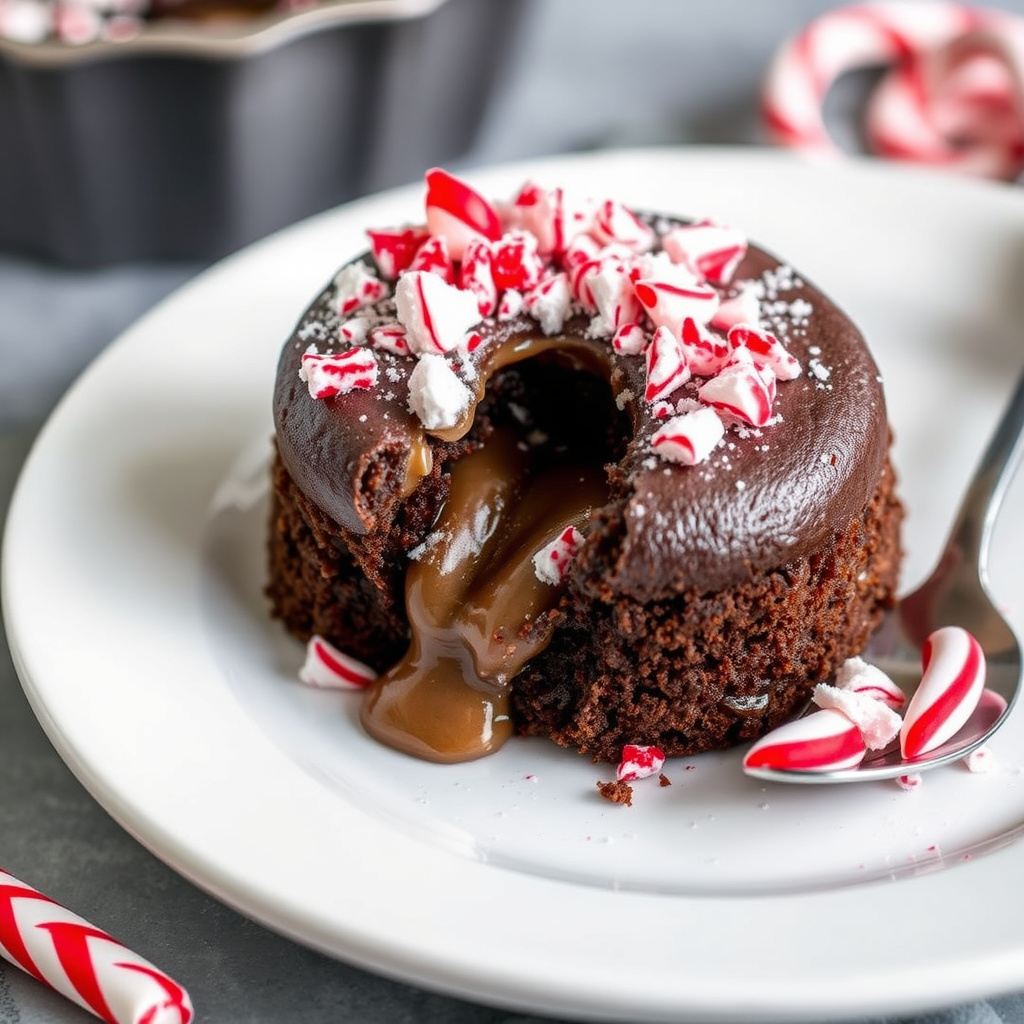 oppskrift på deilig molten chocolate cake toppet med knust pepperkake for en varm og søt dessert. perfekt for jul og vinterkvelder.