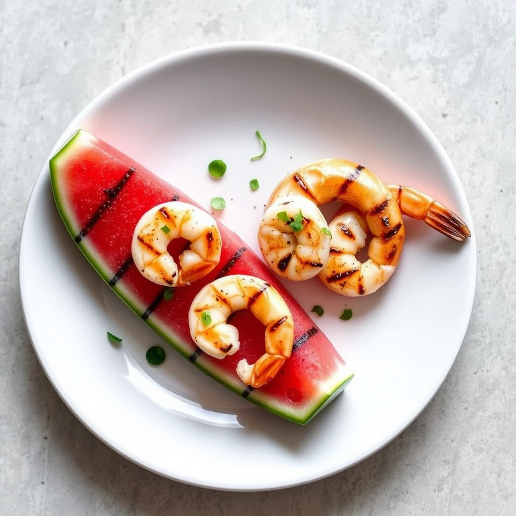 oppskrift på grillet vannmelon og reker, en frisk og smakfull rett perfekt for sommerdager. lett å lage og full av smak.