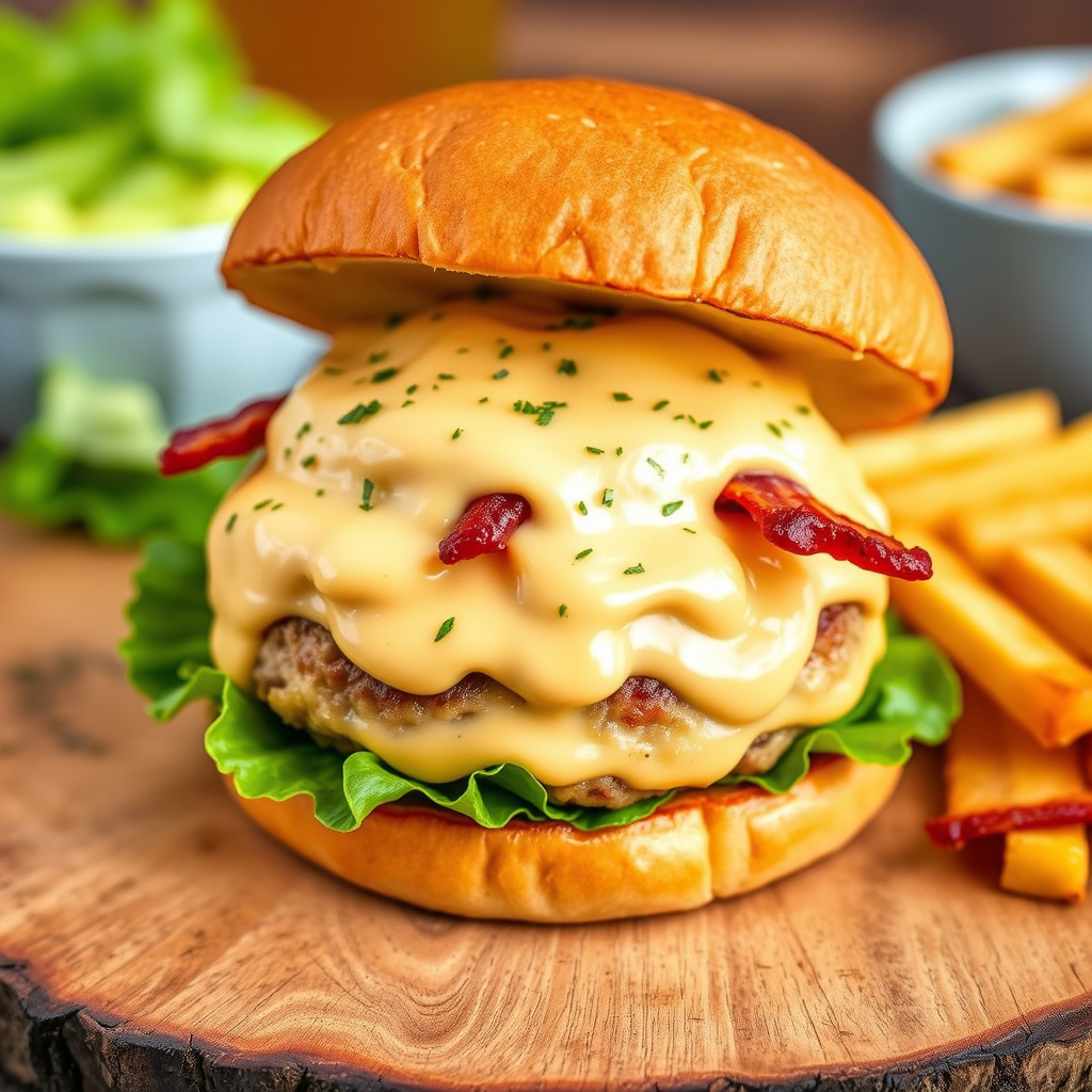 Butterburger med øl-ostesaus og bacon