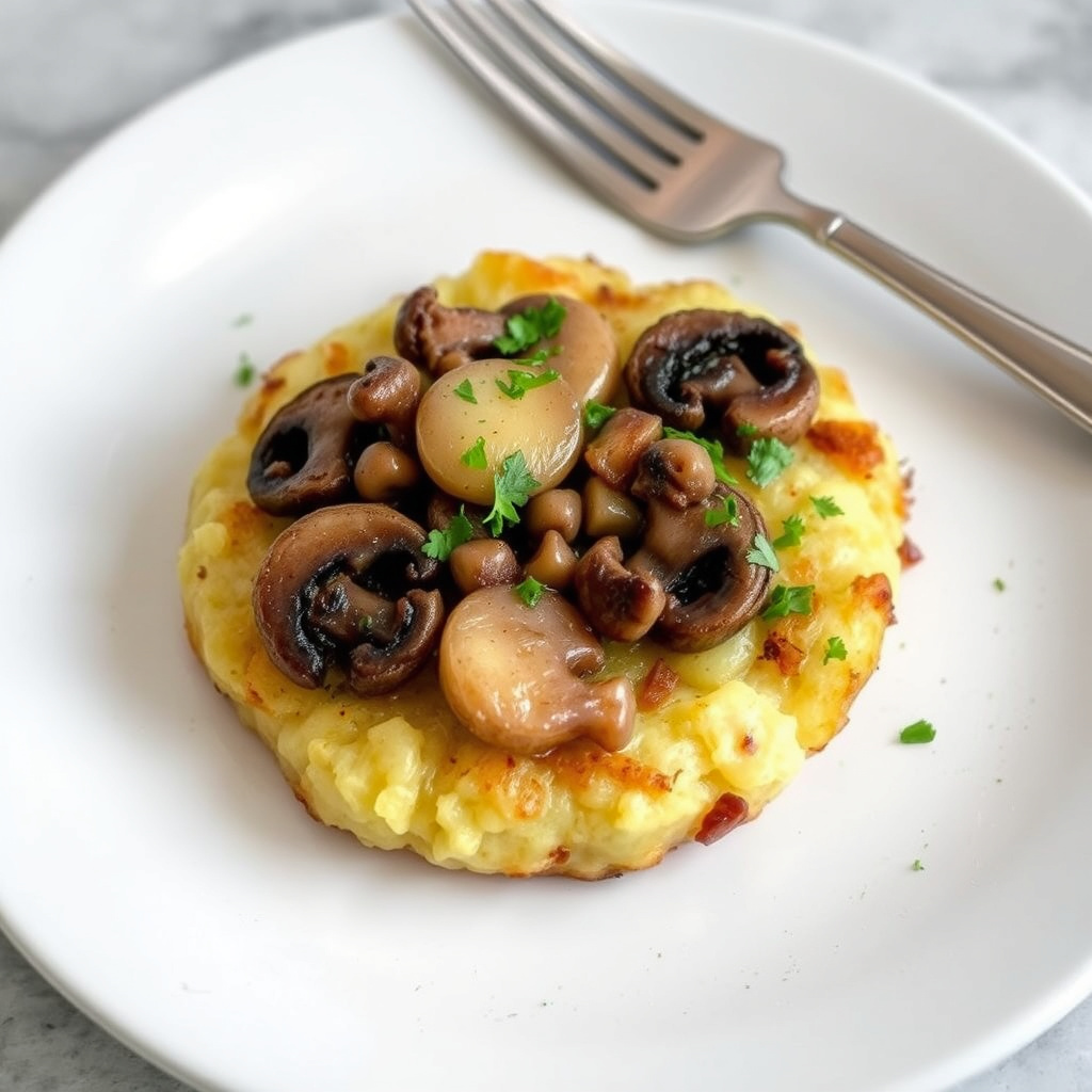 2Skrell en potet og riv den grovt i en bolle med kaldt vann. Gjenta prosessen med de resterende potetene. Varm opp 3 spiseskjeer klarert smør i en tykk, 15-20 cm stor stekepanne over middels varme til det er varmt, men ikke røykende. La halvparten av de revne potetene renne av på kjøkkenpapir og klapp dem tørre. Krydre med salt og pepper, og vend godt sammen. Fordel forsiktig halvparten av de krydrede potetene i den varme pannen. Topp med halvparten av de kokte soppskivene, og fordel deretter resten av de krydrede potetene på toppen. Bruk en slikkepott til forsiktig å presse potetene ned, og drypp over 1 til 2 spiseskjeer klarert smør. La det koke til det er gyllent, ca. 15 minutter.