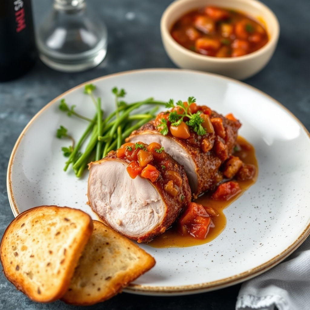 oppskrift på sprø svinenakke med fennel- og tomatchutney, perfekt for en smakfull hovedrett. enkel å lage og full av smak.