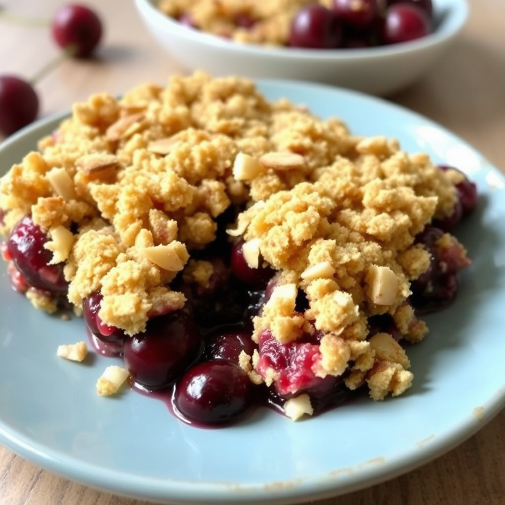 oppskrift på cherry almond crumble, en deilig dessert med kirsebær og mandel, perfekt for sommer- og høstsesongen. enkel å lage og smakfull.
