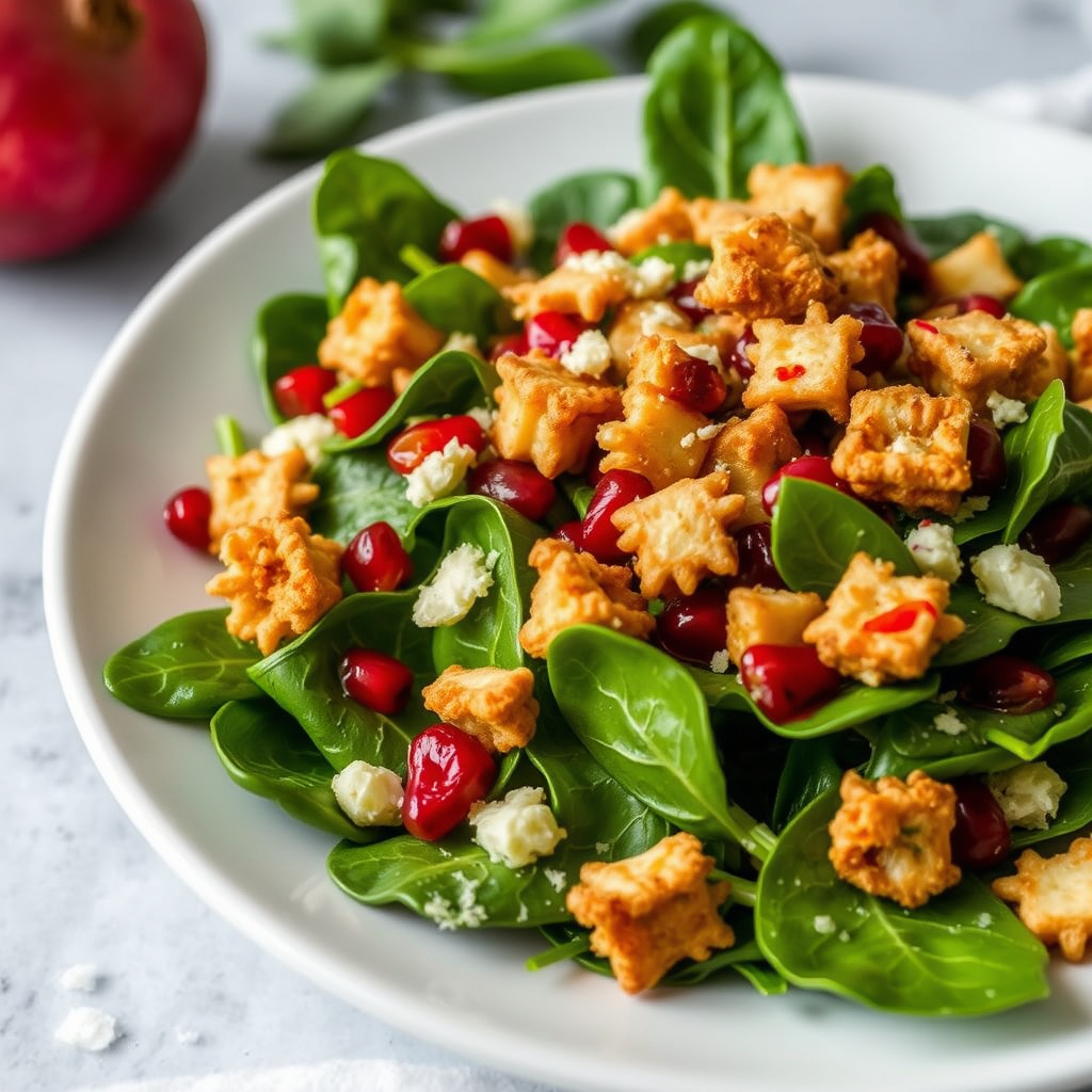 oppskrift på en frisk spinatsalat med søtlig granateple dressing og sprø won ton croutons, perfekt som forrett eller lett middag