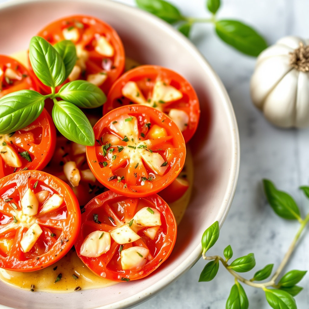 oppskrift på smakfulle hvitløk- og urtetomater, perfekt som forrett eller som tilbehør. enkel å lage og full av smak.