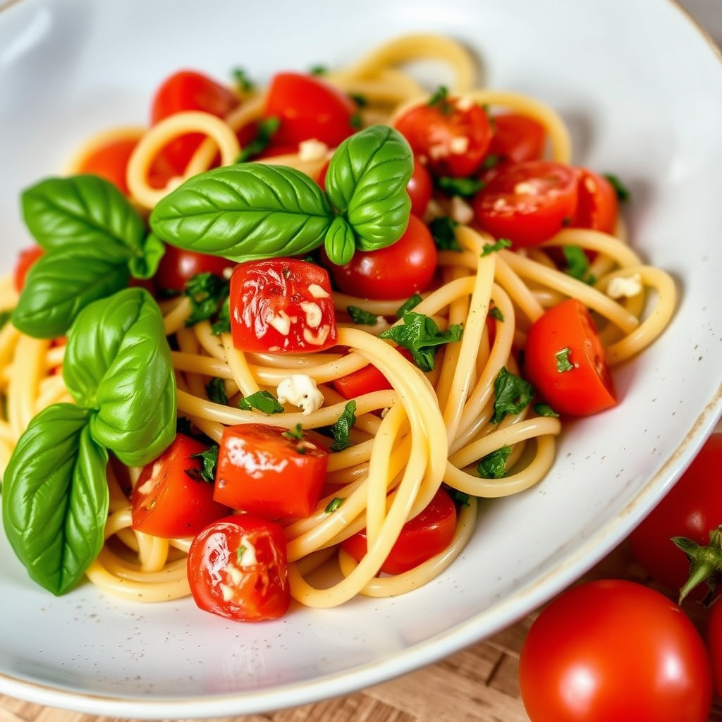 oppskrift på linguine med friske rå tomater og basilikum, perfekt for en lett sommermiddag. enkelt å lage og full av smak.