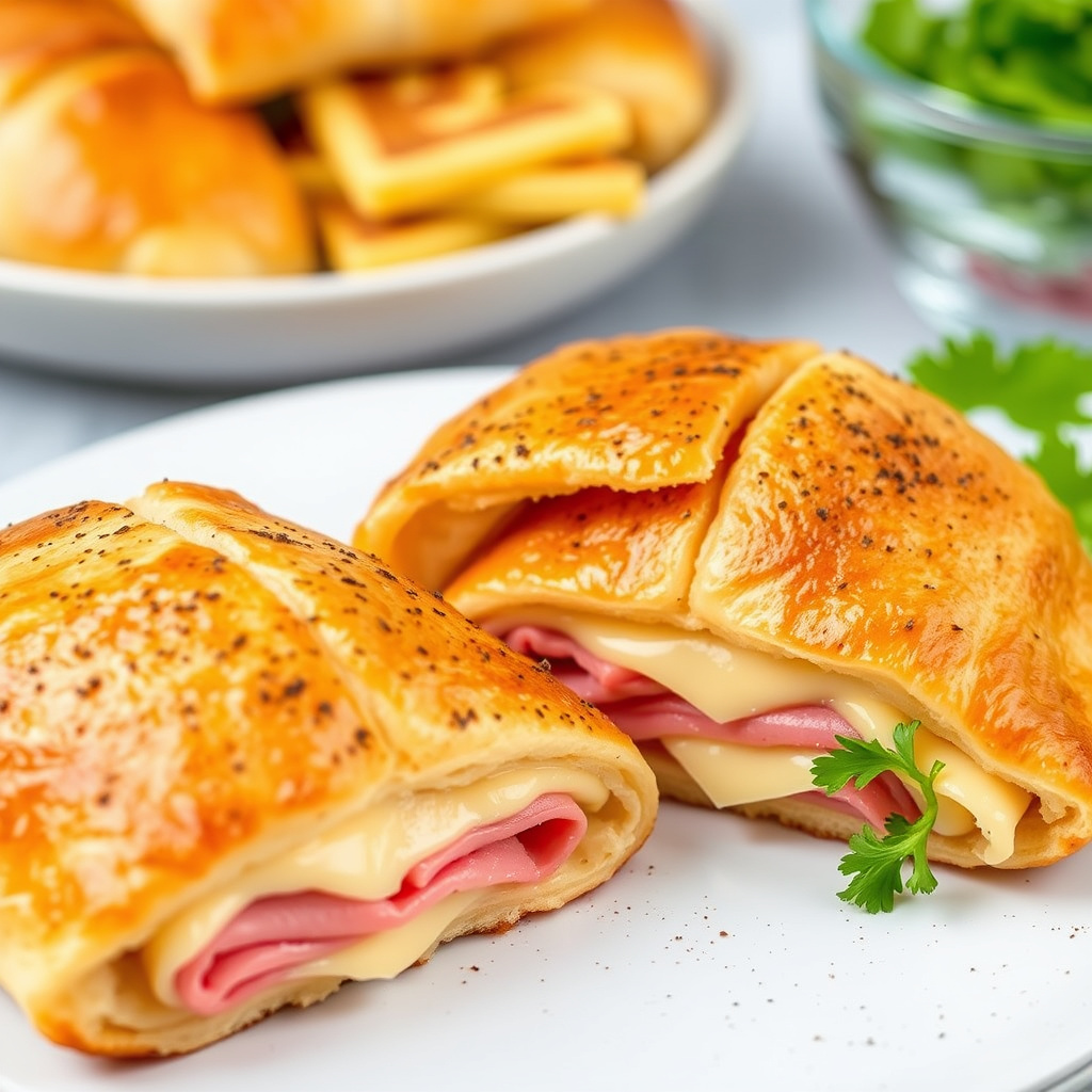 33. Legg én skive skinke og én skive ost på hver rektangel. Brett deigen i to over fyllet; trykk godt langs kantene for å forsegle.