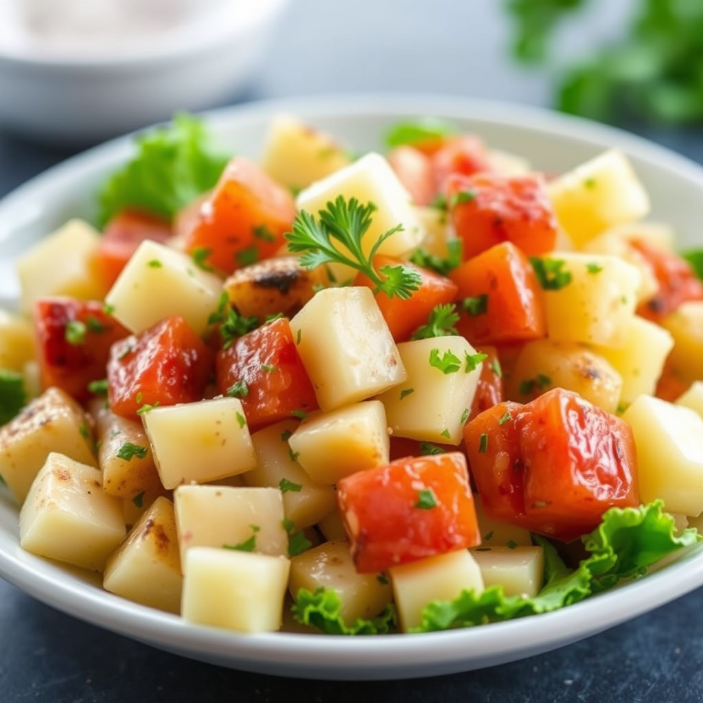 55. Overfør potetsalaten til et stort serveringsfat eller en bolle, og topp med resten av baconet og de reserverte vårløkskivene før servering.