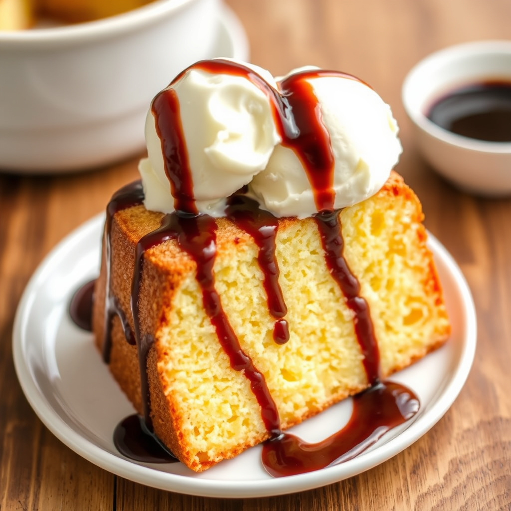 Lær hvordan du lager en deilig pound cake servert med kremet vaniljeis og rik sjokoladesaus. Perfekt som dessert for enhver anledning.