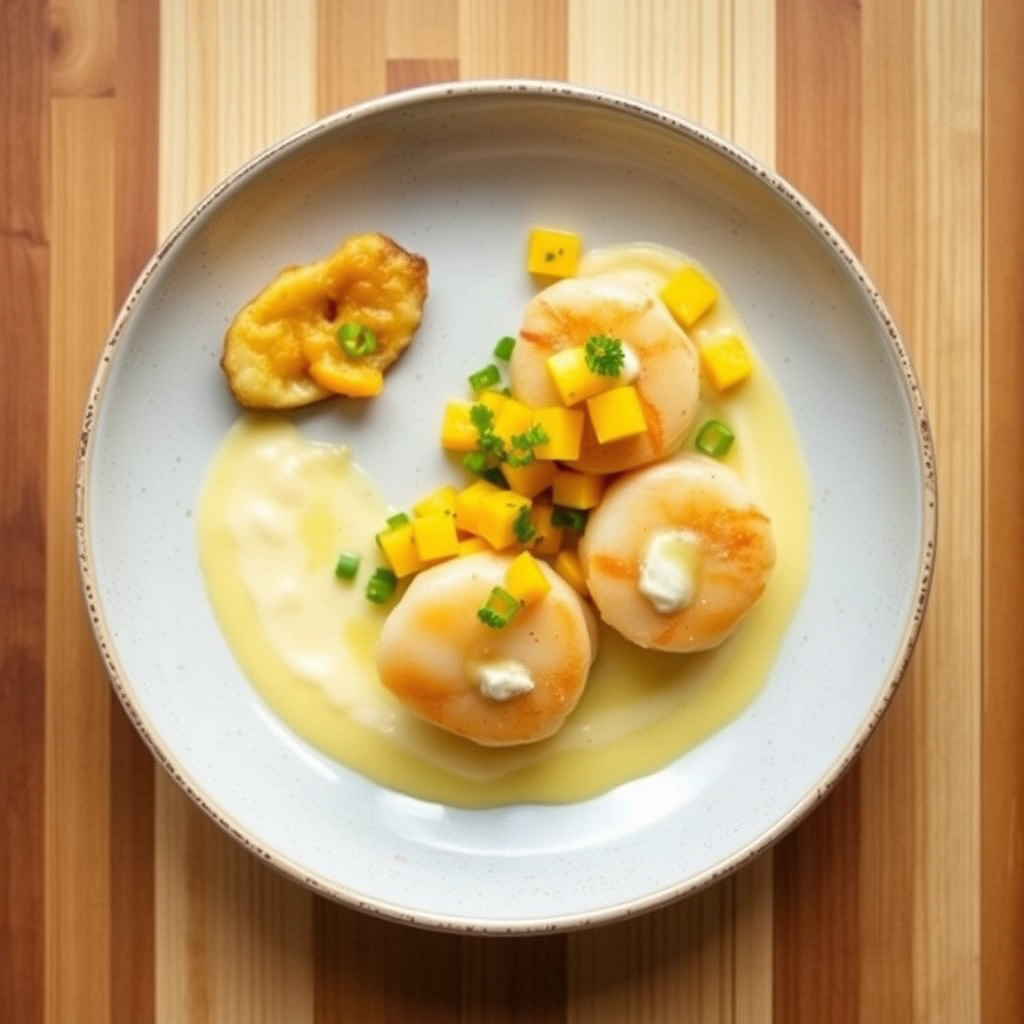 oppskrift på scallops servert med krydret habanero kokos saus og frisk habanero mango salsa. perfekt for en smakfull forrett eller hovedrett i sommer.