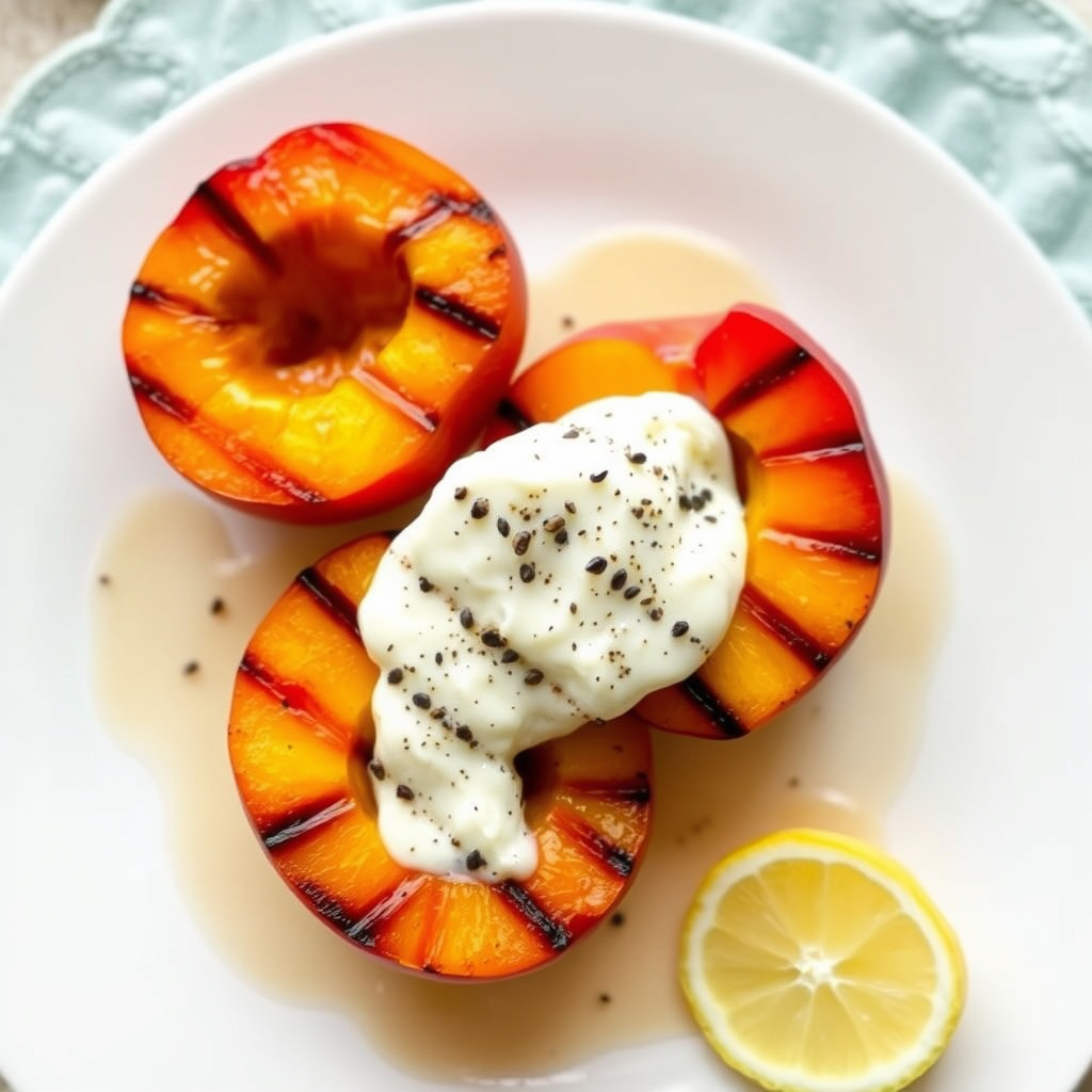 oppskrift på grillede fersken fylt med vanilje og sitron mascarpone. en frisk og smakfull dessert perfekt for sommeren.