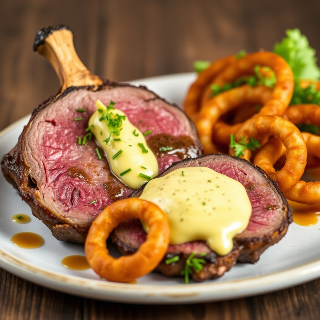 lær hvordan du lager en smakfull roast av vilt med kremet remulade og sprøstekte løkkrøller. enkel oppskrift for en elegant hovedrett.