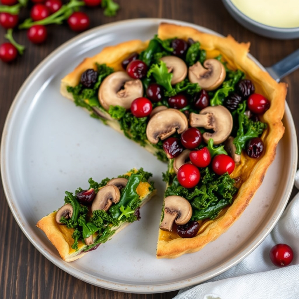 oppskrift på en deilig tart med kale, sopp og tranebær, perfekt for høsten. enkel å lage og full av smak.