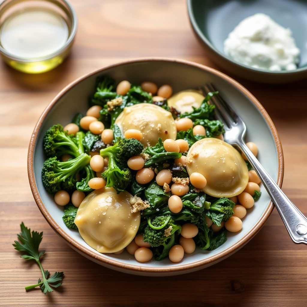 oppskrift på broccoli rabe med hvite bønner og fersk ravioli. en smakfull og næringsrik rett som er enkel å lage for hele familien.